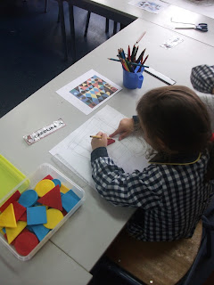 Depois de vermos , falarmos sobre a obra, escolhemos a que queríamos reproduzir... Experimentamos desenhar com régua e contornar as formas geométricas dos blocos lógicos...