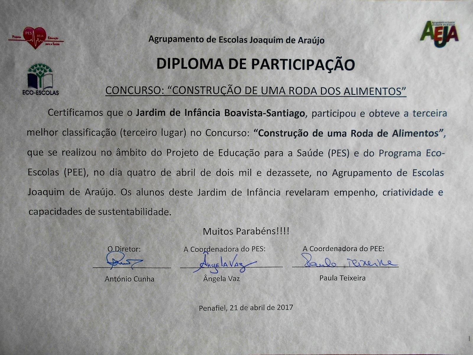 (Coordenadora PES ».Hoje , na sede do Agrupamento de Escolas Joaquim de Araújo , foi-nos entregue o diploma de participação e o prémio...