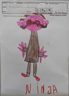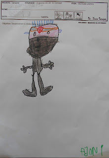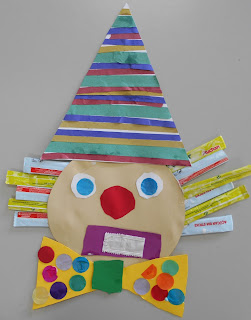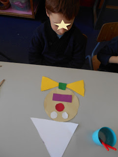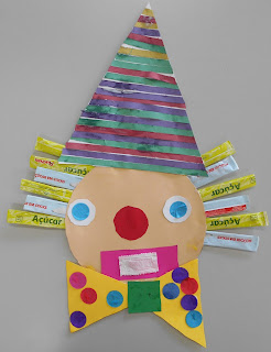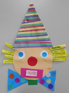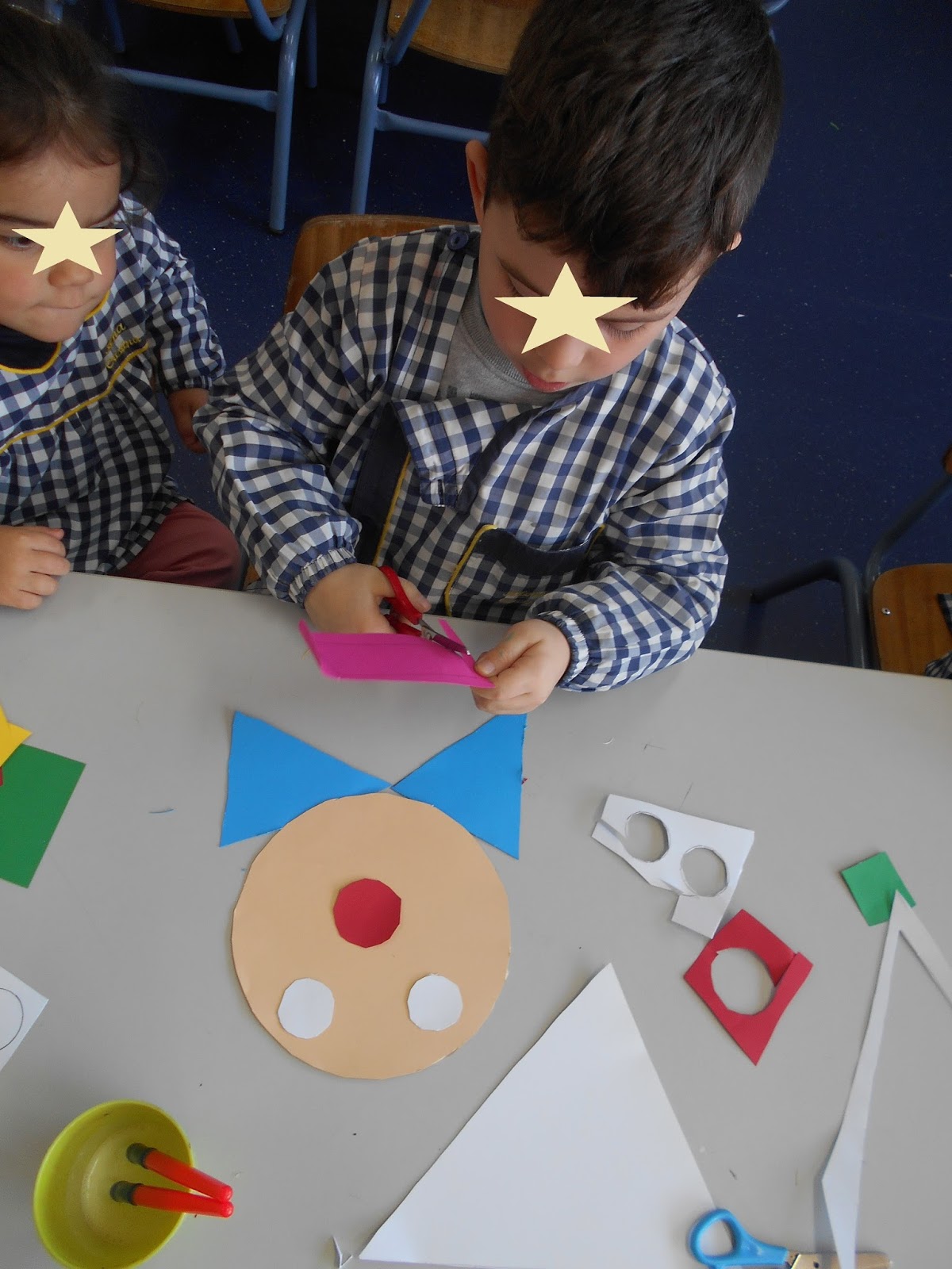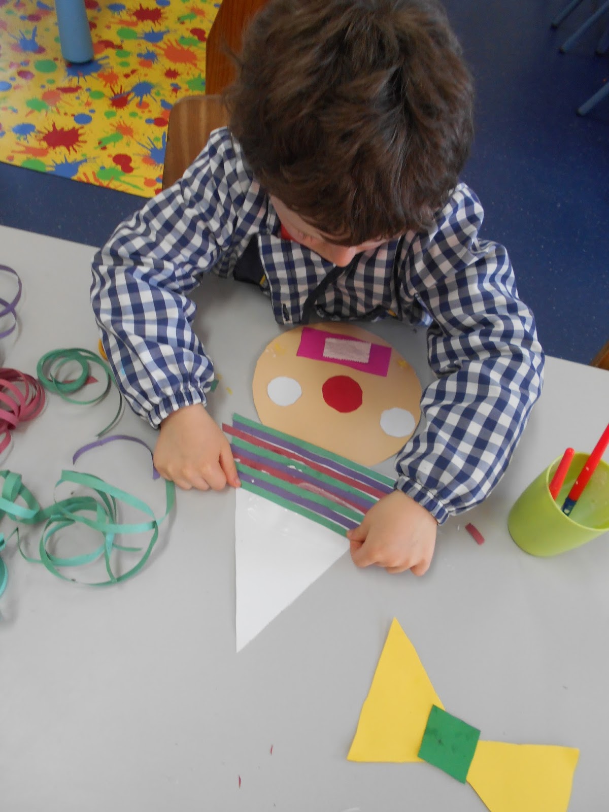 E porque só de tarde se realizou a nossa festa de Carnaval, no período da manhã, decorreu como habitualmente... trabalhamos e brincamos.... a aprendemos esta canção  Figuras geométricas.wma e  tal como diz a canção o triângulo serve para  fazer chapéus para os palhacinhos... E porque não fazer um palhacinho todo com formas geométricas??? Foi o que fomos fazer de seguida.... Usamos cartolinas, serpentinas, confettis grandes e pacotes vazios de açúcar e o invólucro dos pauzinhos de mexer o café. Tudo formas geométricas.